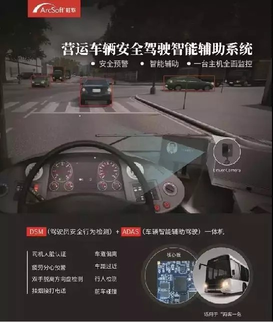通過嵌入式終端設備搭載AI影像增強技術、人體與人臉分析技術、AI全景成像技術、AI視覺認知技術、人像與人體視覺技術等一系列基于卷積神經網絡的虹軟原創視覺AI算法,無論在前裝還是后裝中,虹軟的DSM、ADAS、BSD(盲區檢測)等車載視覺智能技術已可實現駕駛員身份識別、疲勞檢測、分心檢測、吸煙檢測、雙\單手握方向盤檢測、接打電話檢測、手勢舒適度操控、車道偏離報警、前車碰撞報警、盲區檢測報警、車距過近報警等全套功能。