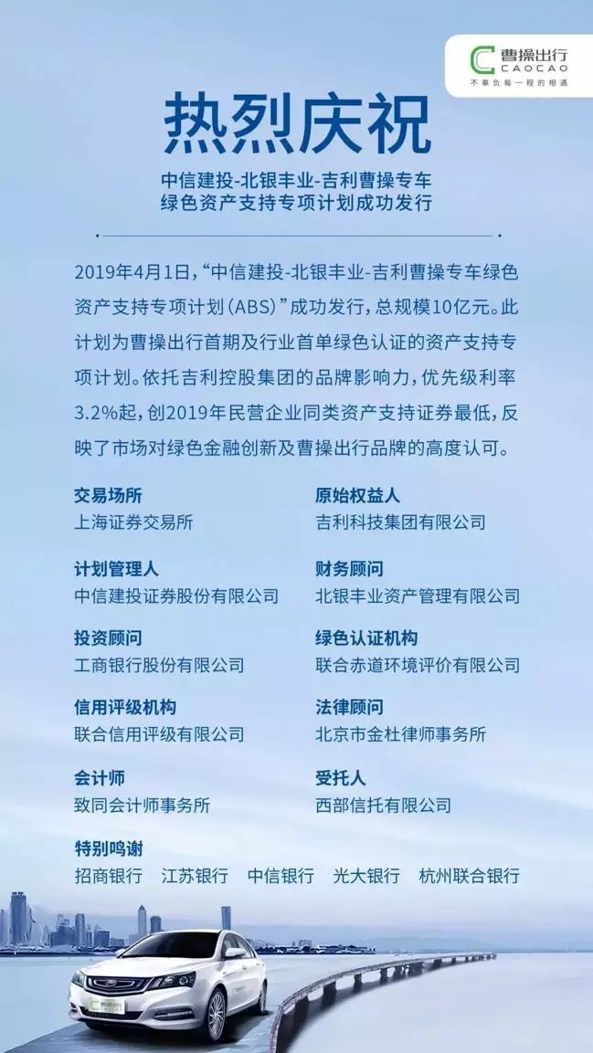 2019年4月1日,“中信建投-北銀豐業-吉利曹操專車綠色資產支持專項計劃(ABS)”成功發行,總規模10億元。此計劃為天堂硅谷投資項目曹操出行首期及行業首單綠色認證的資產支持專項計劃。依托吉利控股集團的品牌影響力,優先級利率3.2%起,創2019年民營企業同類資產支持證券最低,反映了市場對綠色金融創新及曹操出行品牌的高度認可。